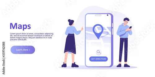 GPS navigation service application. Smartphone map application. Search map navigation on app. Location pin on screen. GPS technology. Landing page template. Web banner. Isolated vector illustration