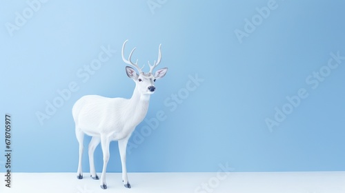 Graceful fawn standing poised against a soft blue backdrop, showcasing its delicate features.