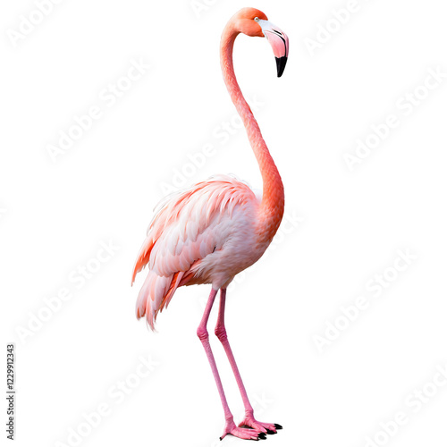 Graceful flamingo standing on one leg with striking pink feathers isolated on a clean PNG background, highlighting the bird's unique stance and vibrant colors, ideal for tropical illustrations, nature