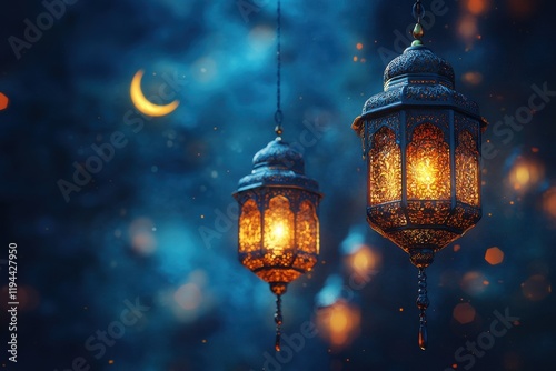 Graceful Ramadan Kareem Design Featuring Lanterns and Crescent Moon Motifs theme