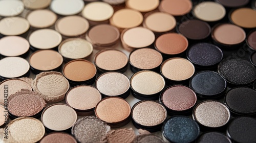 Gradient of makeup swatches featuring an array of light to dark tones presented in circular pans on a neutral background, highlighting texture and variety.