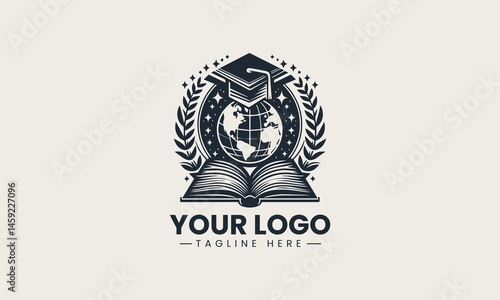 Graduation cap on globe with open book and laurel wreath in educational vector logo concept