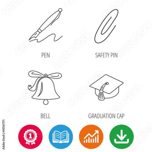 Graduation cap, pen and bell icons. Safety pin linear signs. Award medal, growth chart and opened book web icons. Download arrow. Vector