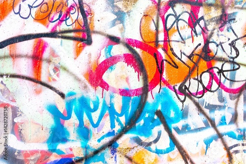 Graffiti pattern with neon pink, blue, orange on wall. Urban 90s street art, trippy, vibrant lines. Posters, backgrounds, modern digital art, creative banners.
