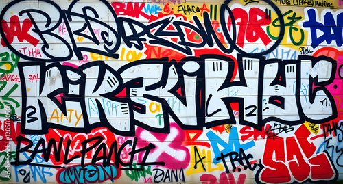 Graffiti-covered urban wall background. Colorful, chaotic street art patterns. Edgy and rebellious