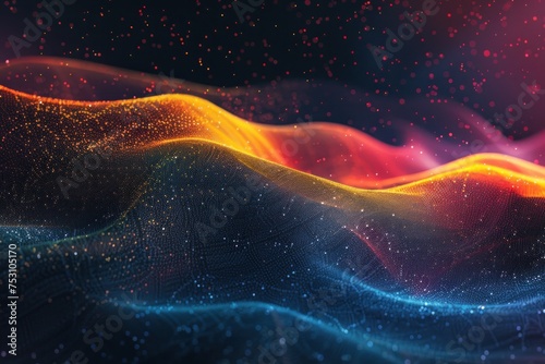Grainy gradient background blue yellow red abstract glowing color wave black backdrop vibrant dark noise texture design