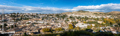 Granada town in Spain from the Alhambra complex. Panoramic view of a city nestled on a hillside under a vibrant blue sky. Panoramic view of a historic town nestled against rolling hills, architectural