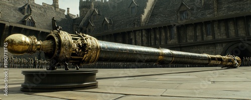 Grand Historic Ceremony Featuring Ornate Scepter in Majestic Castle Courtyard Setting