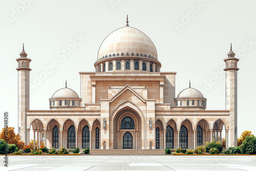 Grand mosque exterior, autumn foliage, serene atmosphere, architectural study