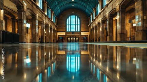 Grand station hall reflection, city transit, morning calm