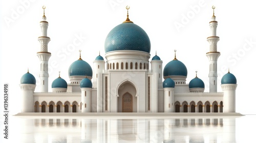 Grand White Mosque with Blue Domes and Minarets Reflecting on Clear Surface