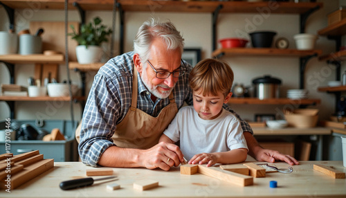 Grandfather and grandson collaborating on DIY project in workshop, bonding