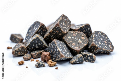 Granite fragments in isolation on white surface, ground texture, mineral, granite