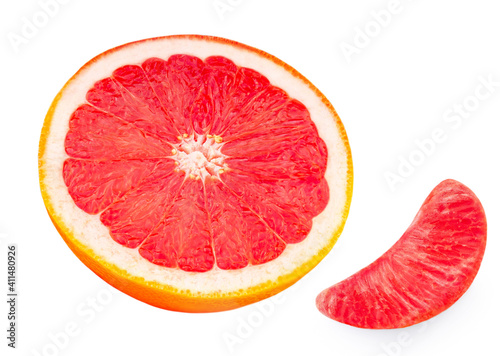Grapefruit half isolated on white background close up. Ripe slice of pink grapefruit citrus fruit Flat lay. Top view.