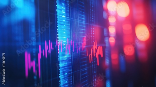 graph with neon red and blue lights displays dynamic data patterns, symbolizing market analysis, technology, and the fast-paced world of finance