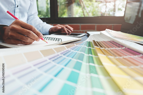 Graphic design and color swatches and pens on a desk. Architectural drawing with work tools and accessories.