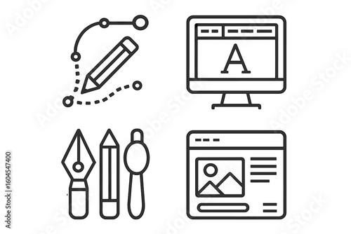 Graphic design icon set. Vector illustration of creative process. Web design, typography, and digital art tools. UI, UX, interface layout. Pen, pencil, and monitor icons.