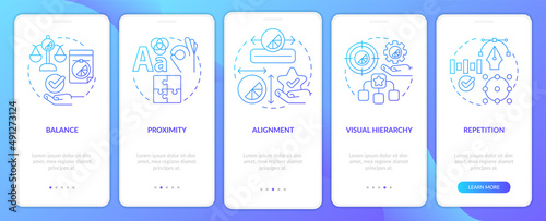 Graphic design principles blue gradient onboarding mobile app screen. Art walkthrough 5 steps graphic instructions pages with linear concepts. UI, UX, GUI template. Myriad Pro-Bold, Regular fonts used