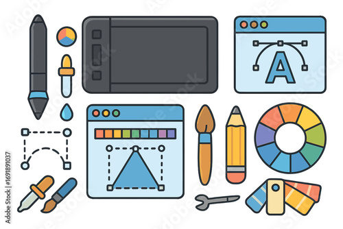 Graphic design tools icon set. Vector illustration elements for digital art. Creative software kit with tablet, pen, color wheel, palette. Drawing, typography & UI/UX icons.