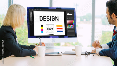 Graphic designer software for modern design of web page and commercial ads showing on the computer screen