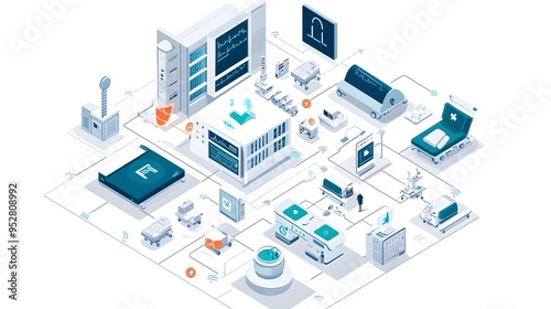 Graphic Illustrating IoT Internet of Things Systems that Ensure a Secure and Safe Hospital Environment for Patients by Providing Advanced Monitoring Analytics and Automation Technologies