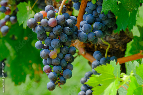 Grappoli d'uva vicini alla piena maturazione in un vigneto.