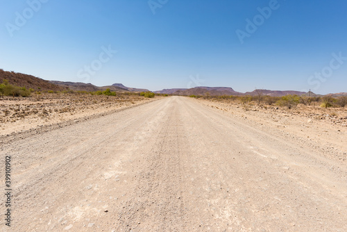 Gravel road crossing the Namib desert, in the majestic Namib Naukluft National Park, best travel destination in Namibia, Africa. Toned image, vintage old retro filter.