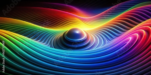Gravitational waves rippling through spacetime, illustrated as swirling, rainbow-colored patterns on a deep, inky black background with precise, wavy lines.