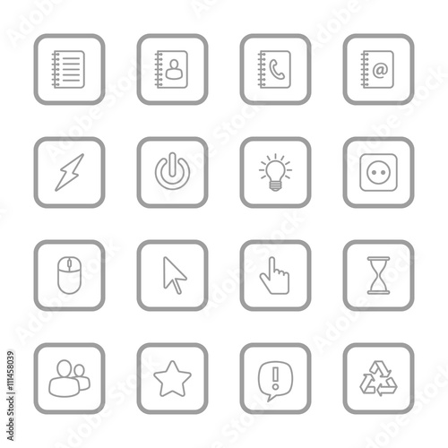 gray line web icon set with rounded rectangle frame for web design, user interface (UI), infographic and mobile application (apps)