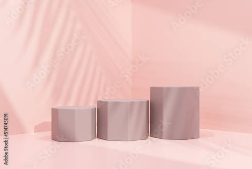 Gray podium with leaf shadow on pastel pink background 3D illustration empty pedestal product display scene for product placement