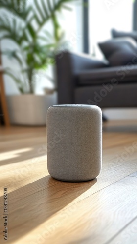 Gray smart speaker on a light wood floor.