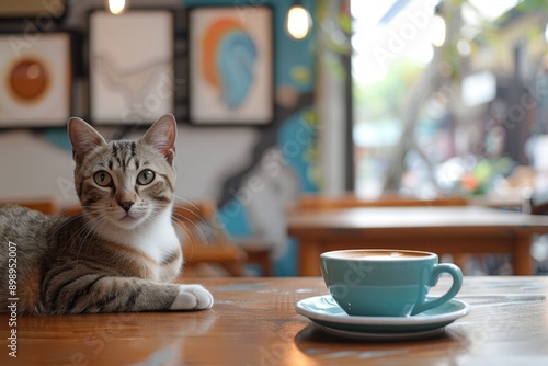 Gray tabby cat sitting next to a cup of coffee with latte art on wooden table in a cozy cafe interior.