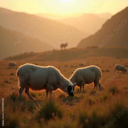 Grazing sheep in golden sunset meadow, tranquil rural scene with distant hills M7B3