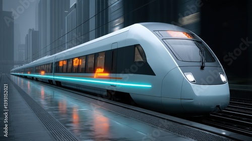 Great depression, A sleek, modern train glides through a futuristic urban landscape, illuminated by ambient lighting, showcasing advanced transportation technology.