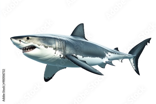 great white shark - Carcharodon carcharias - full view while swimming, face and teeth visible isolated on white background all fins and gills showing, ai