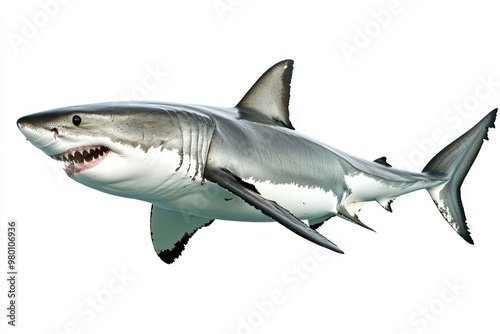 great white shark - Carcharodon carcharias - full view while swimming, face and teeth visible isolated on white background all fins and gills showing, ai
