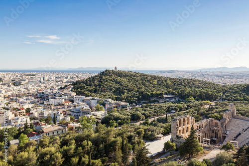 Greece, Athens, view on Odeon, theater of Herodes Atticus, Philopappos Monument, Piraeus in background