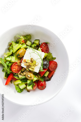 Greek salad in white bowl