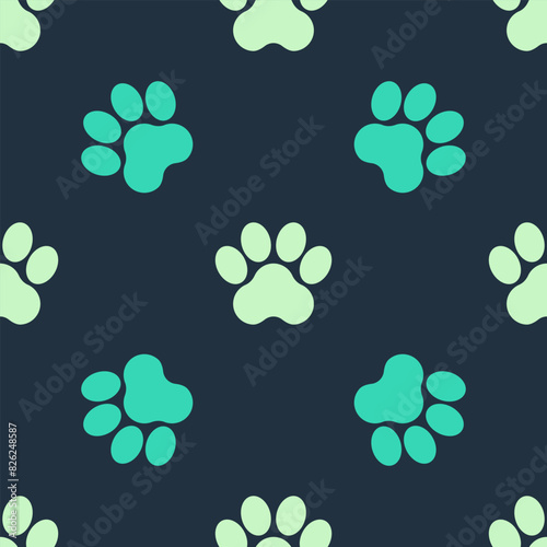 Green and beige Paw print icon isolated seamless pattern on blue background. Dog or cat paw print. Animal track. Vector