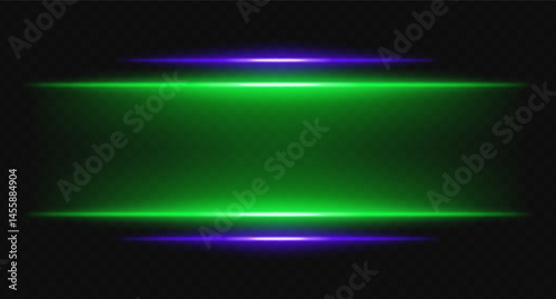 Green and blue glowing horizontal beams on transparent background. Bright layered lights perfect for digital HUD, sci-fi UI borders, and visual accents.