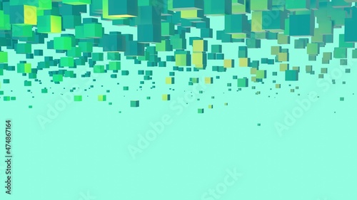 Green and yellow flying matt cubes 3d render background. Ai data protection concept for tech company, business, web development.