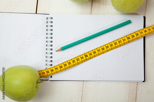 Green apples with measuring tape on a white wooden table