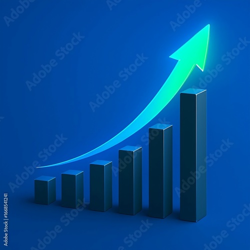 Green arrow curving upwards over a rising bar graph on a blue background