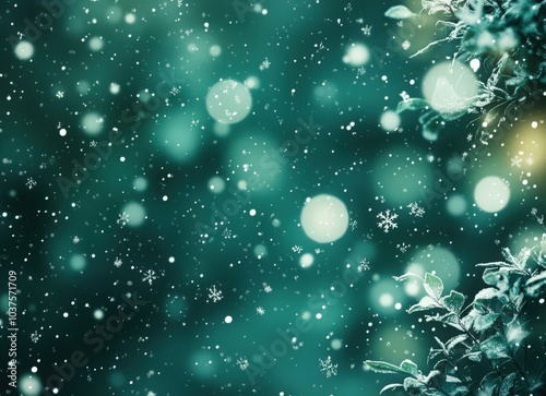 green background with white snowflakes falling, dreamy atmosphere. The stars shimmer in the night sky. shiny stars and a bokeh effect. concept of Christmas and the New Year. Christmas card
