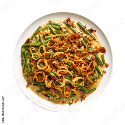 Green Bean Casserole On White Plate, Directly Above View On Isolated Transparent Background, Png. Generative AI