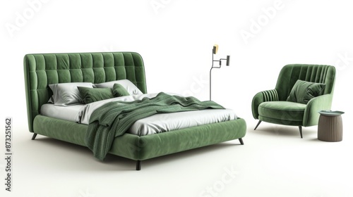 Green bed and armchair set in a bedroom scene, isolated on a white background