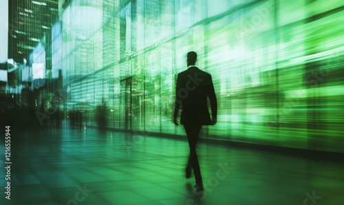 Green business background concept with blurred office building in green light with businessman walking by in motion blur