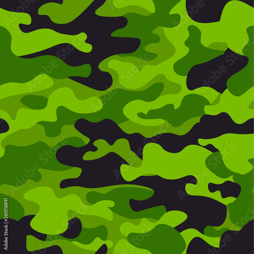 Green camouflage seamless pattern background. Classic clothing style masking camo repeat print. Green, lime, black olive colors forest texture. Design element. Vector illustration.