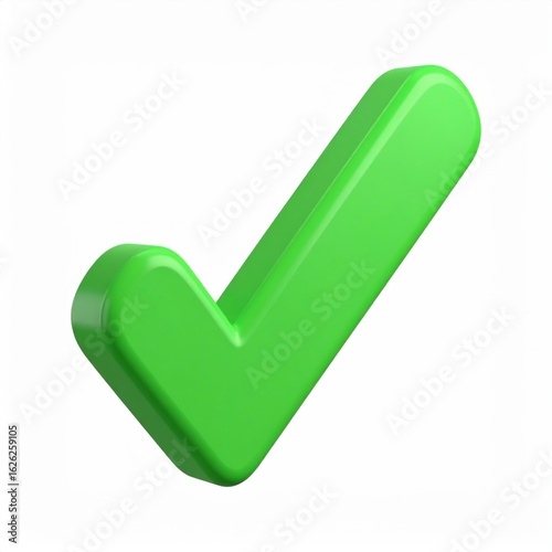 Green Check Mark Icon: A glossy, three-dimensional green check mark symbol isolated on a white background, representing approval or completion.