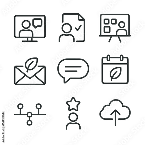 Green Collaboration Icons. Outline icon set of green client collaboration: video call screen, shared document, virtual whiteboard,